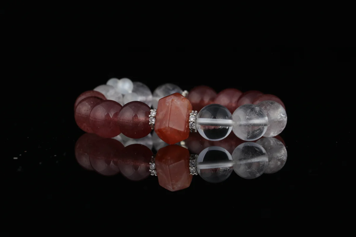 這款手鏈結合了天然草莓晶和白水晶的雙重能量,主要功效包括招正緣桃花、旺人緣貴人運。草莓晶對應心輪,能增強個人魅力與親和力;白水晶則淨化負能量,放大美好頻率。雙石能量疊加,有助於吸引良緣、改善人際關係,使職場社交更順利。此外,它還能根據生辰定制專屬能量,通過左進右出的佩戴方式,實現招財納福的效果。