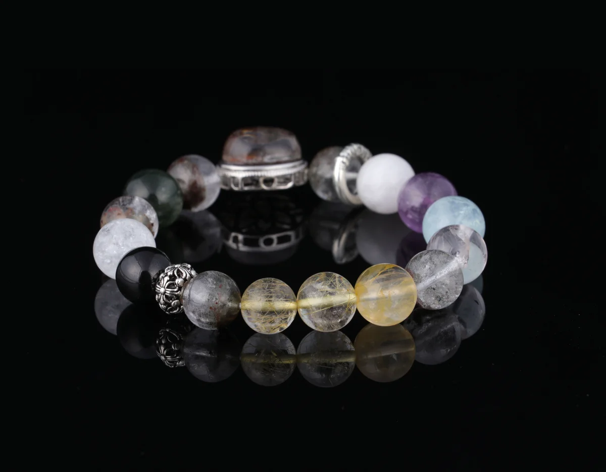 這款天然水晶手鏈集齊花幽靈、海藍寶、紫晶、金髮晶四大能量石,具有多重核心功效:花幽靈旺事業,海藍寶助溝通,紫晶增智慧,金髮晶招偏財。整體專為招財轉運、改善睡眠、提升氣場定制,適合上班族職場開運、失眠者枕邊安神、生意人招財納福。每顆水晶均為天然原礦,對應五行平衡,能有效吸收能量,帶來綜合益處。