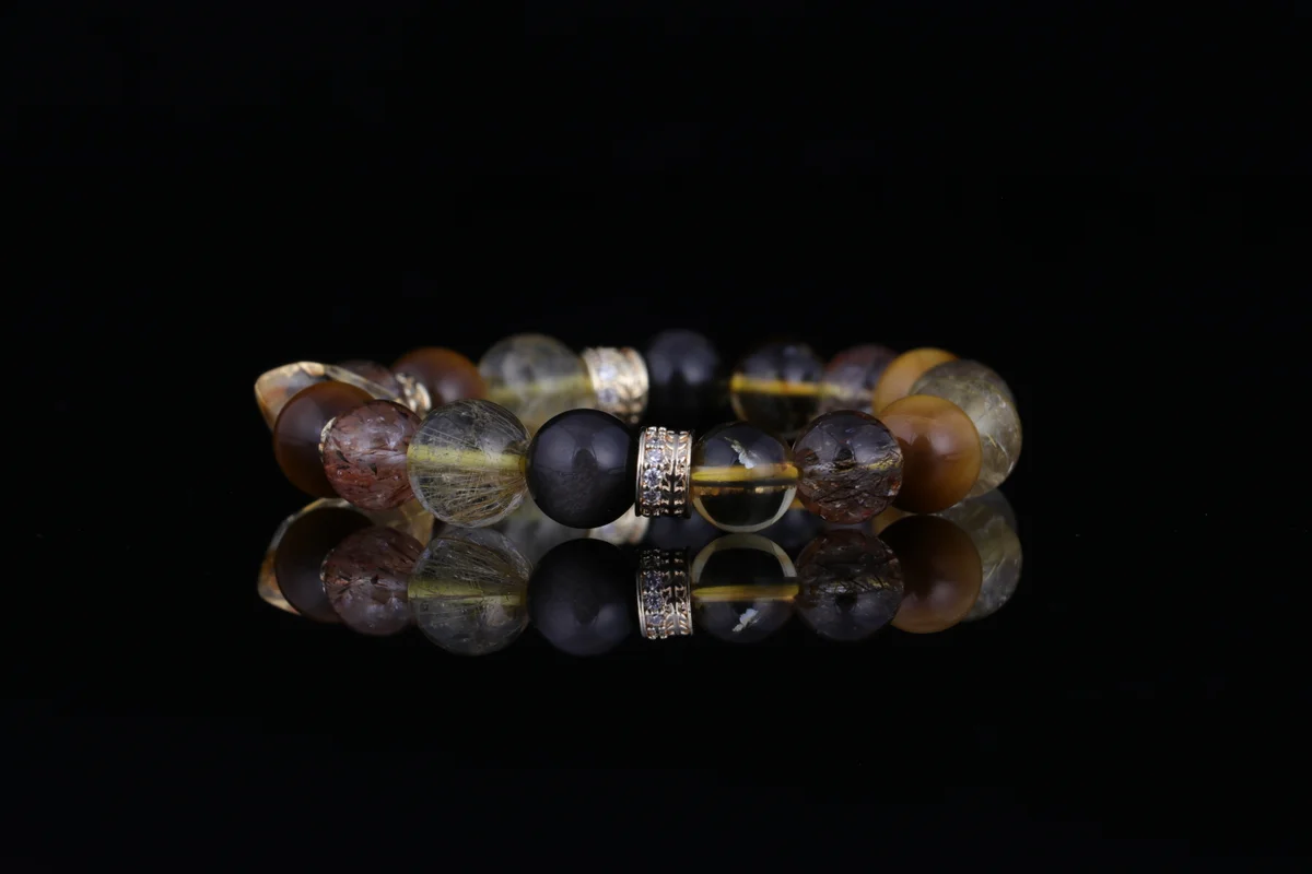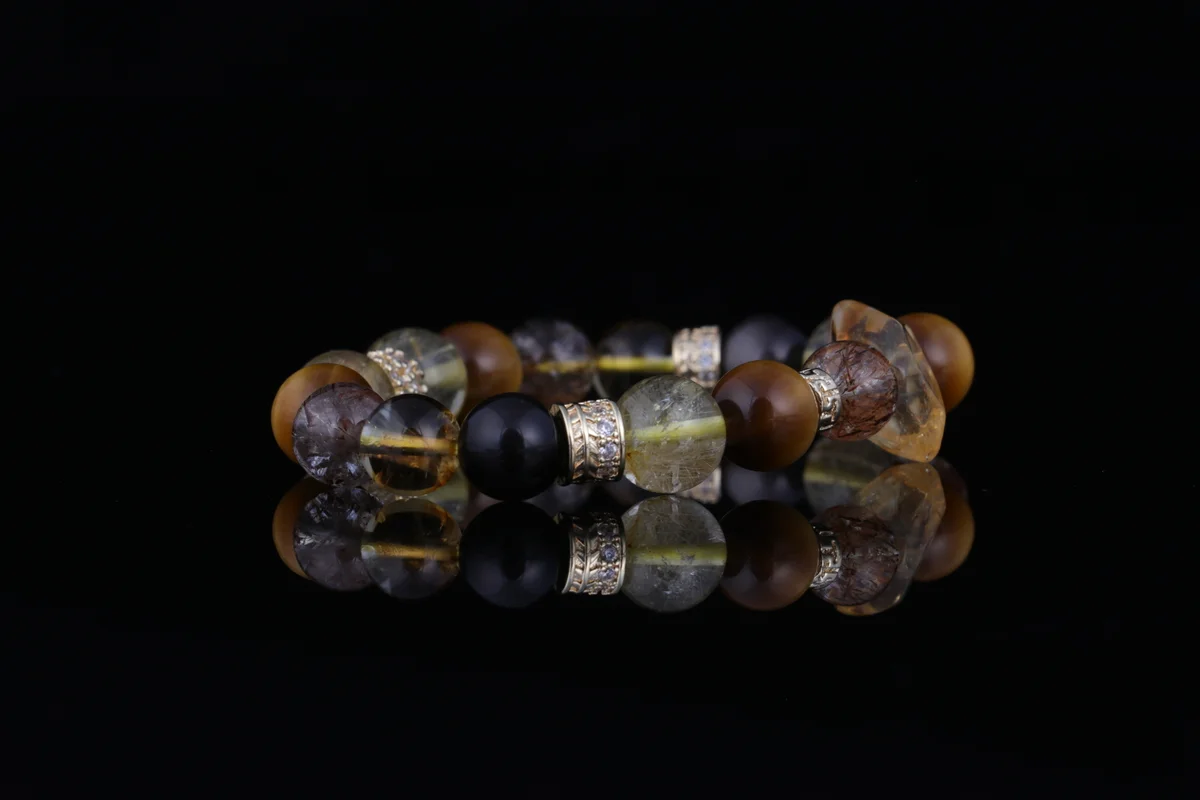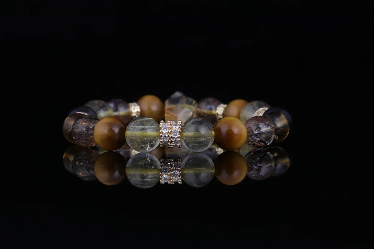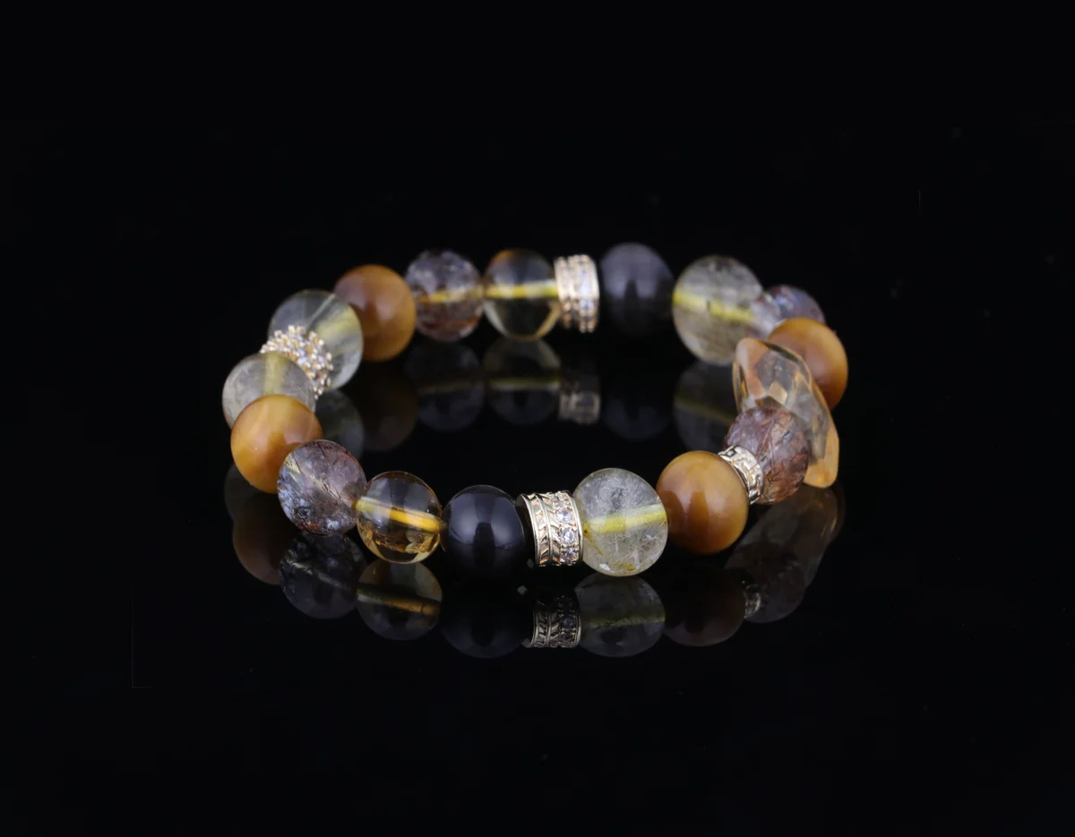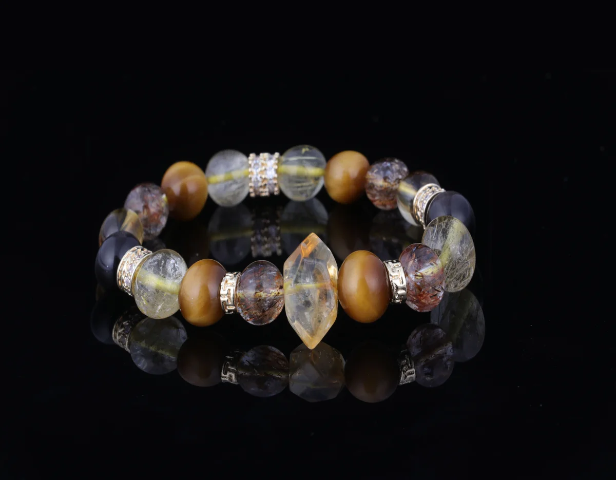 「超7」黃塔晶是這款手串的核心材質之一,根據產品簡介,其能量是普通水晶的3倍,這意味著它能提供更強大的聚財和能量疊加效果。這種晶石結合了金髮晶的「金行」能量,專助事業財運,並與其他材質如七彩光、銀耀石、金虎眼協同作用,實現多頻能量疊加。它不僅增強招正財和偏財的能力,還能辟邪護身、化解小人,適合上班族和經商人士佩戴以提升氣場和財運。