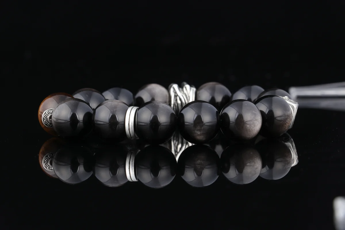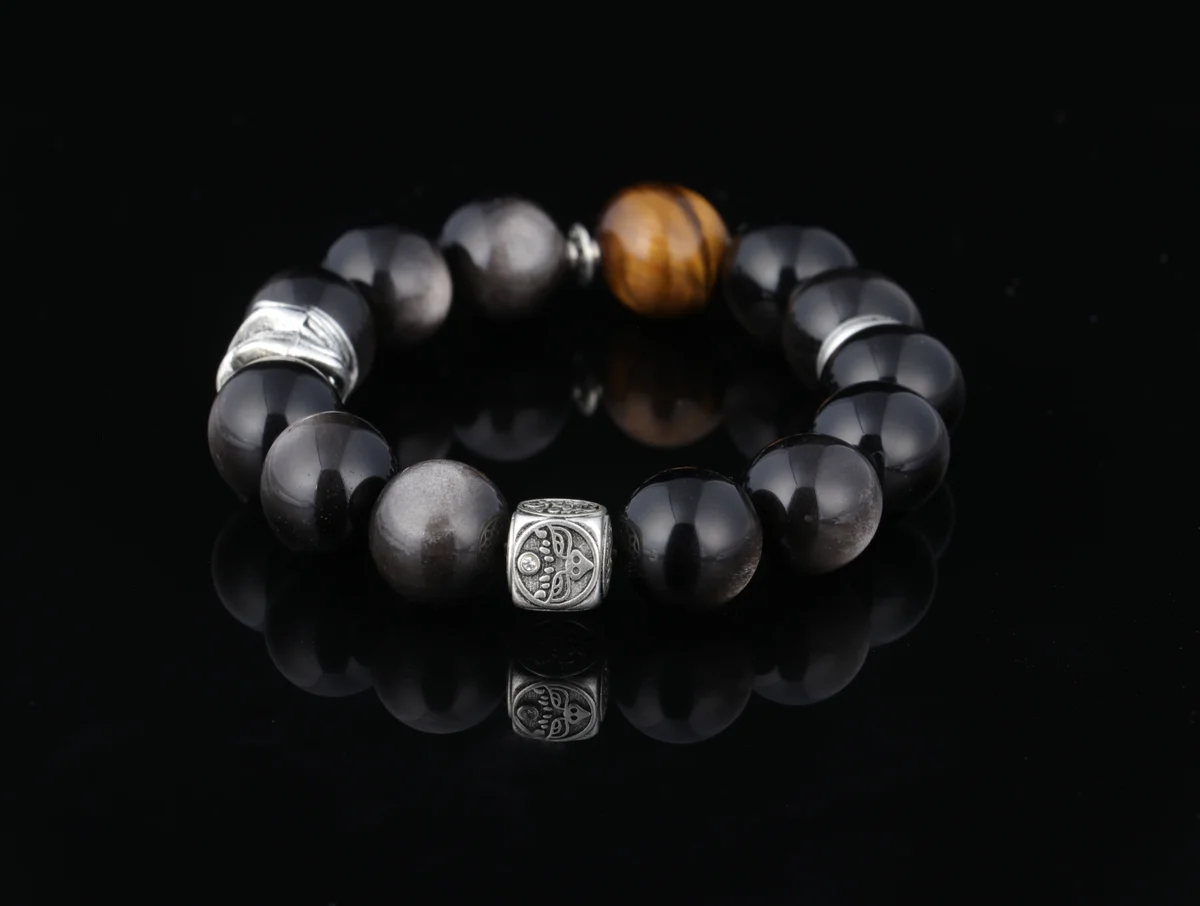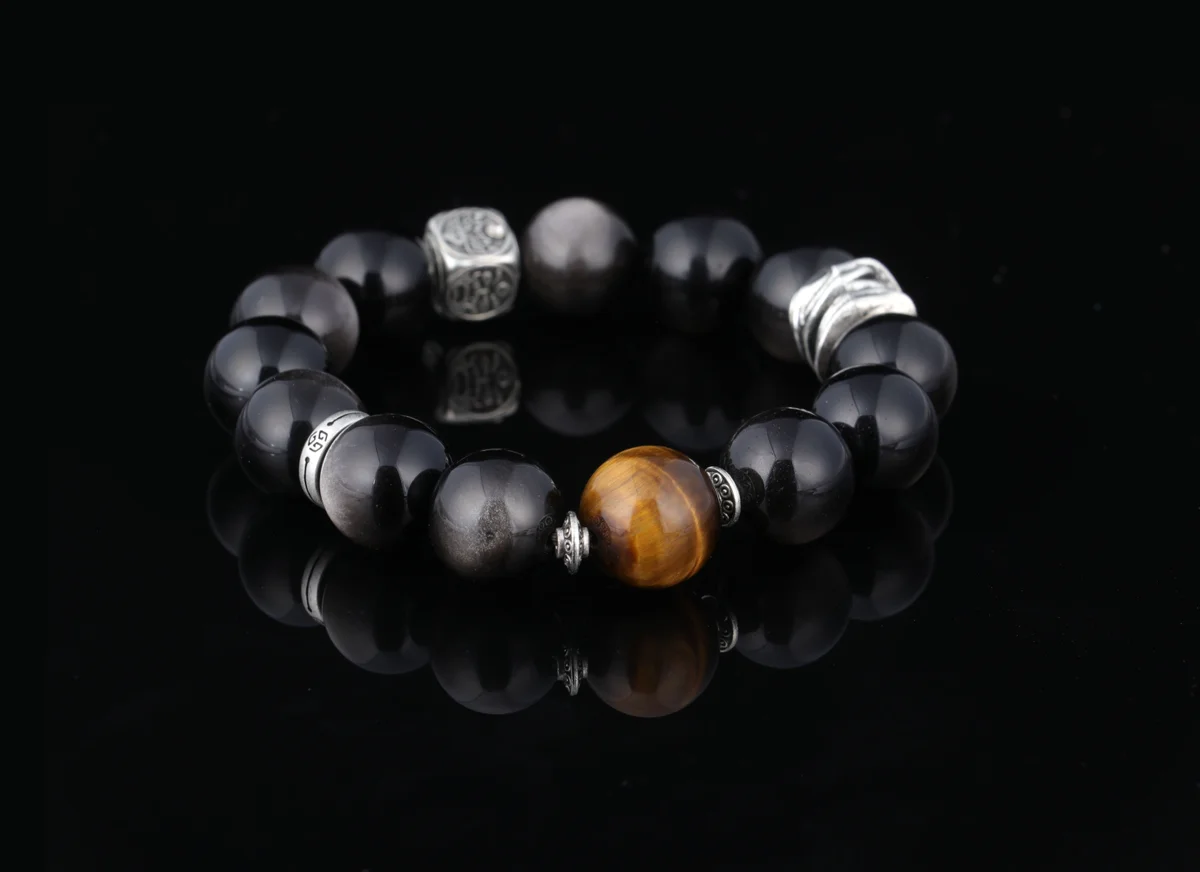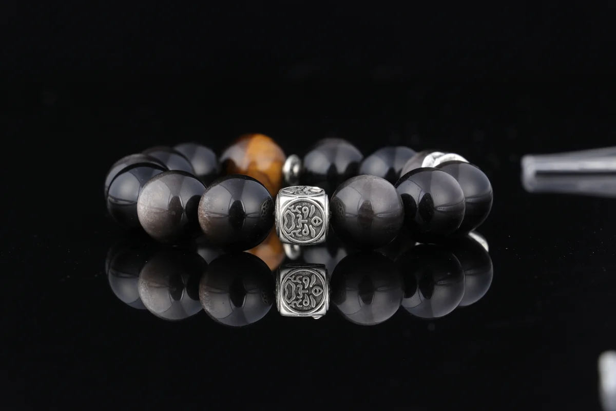 保養這款手串時,建議避免接觸化學物質或硬物刮擦,以保持天然虎眼石和銀曜石的完好。產品簡介中提到它是天然原石手工打磨,每條紋路獨特,定期用軟布擦拭可維持光澤。作為辟邪水晶,存放時最好單獨放置,避免能量干擾,長期佩戴能持續發揮招財轉運、辟邪擋煞的功效。