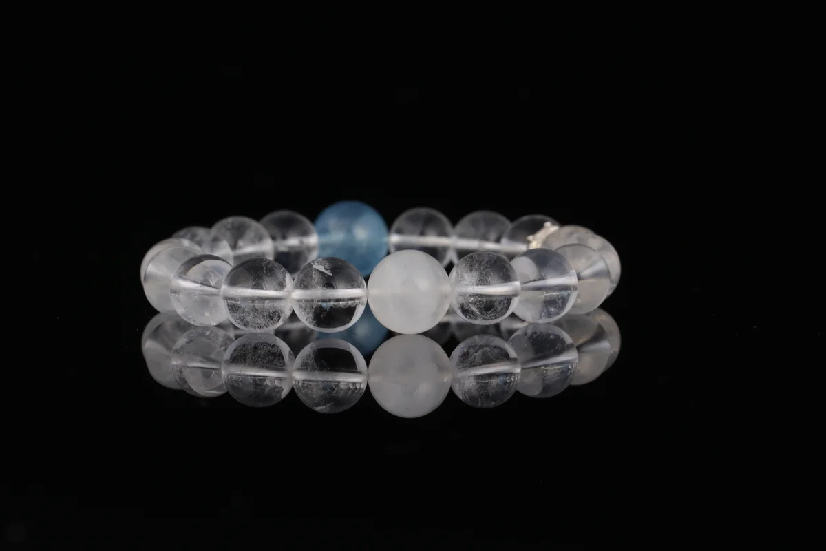 Q.這款天然白水晶白幽靈海藍寶手串有哪些功效?