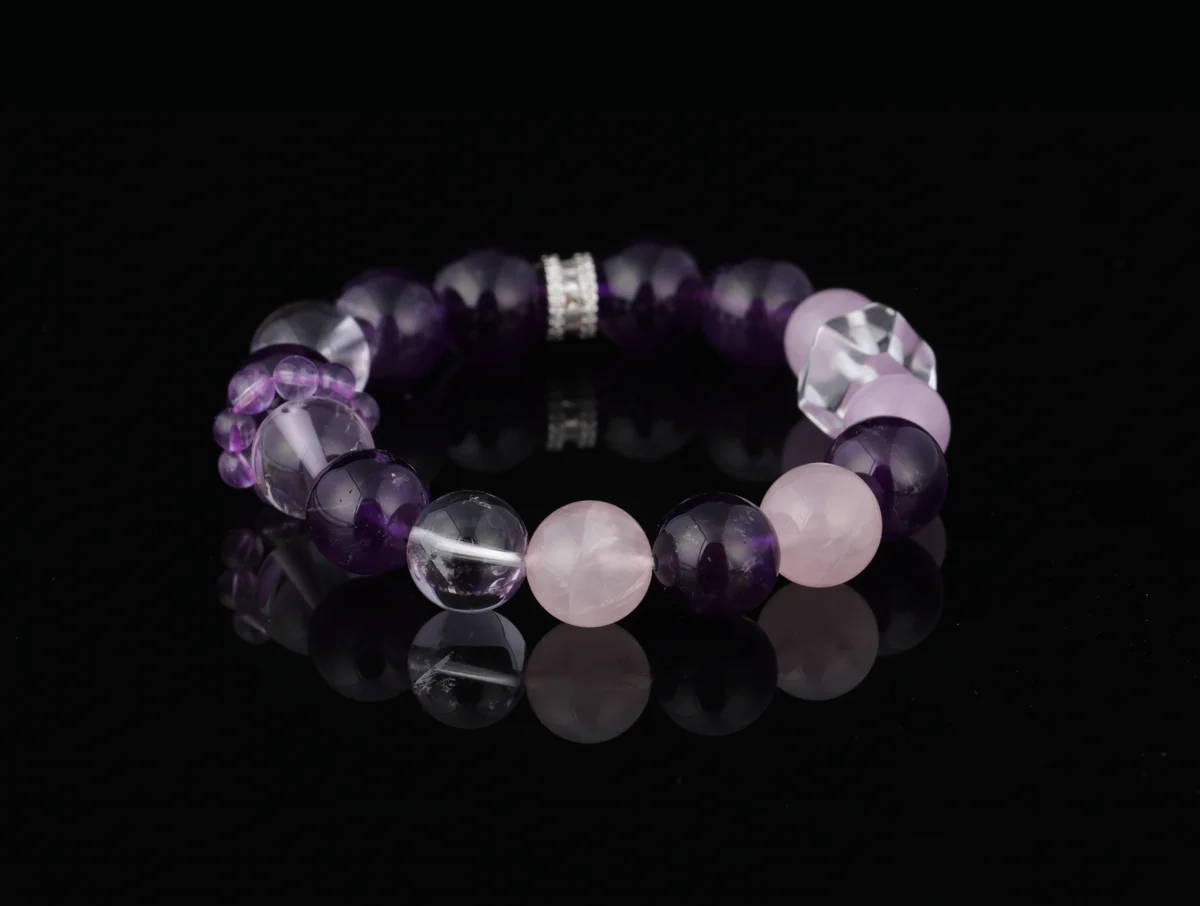 這款天然紫粉晶手鏈融合了粉晶和紫晶的雙色能量,具有多重功效。粉晶能招桃花旺人緣,提升情感運勢;紫晶則助眠減壓增智慧,幫助緩解焦慮和壓力。兩者結合,還能招財旺運,特別適合想要提升財運與情感運勢的人群。產品簡介中提到它是「萬人回購的助眠神器」,睡前佩戴可感受溫柔能量包裹,讓焦慮壓力悄然消散。