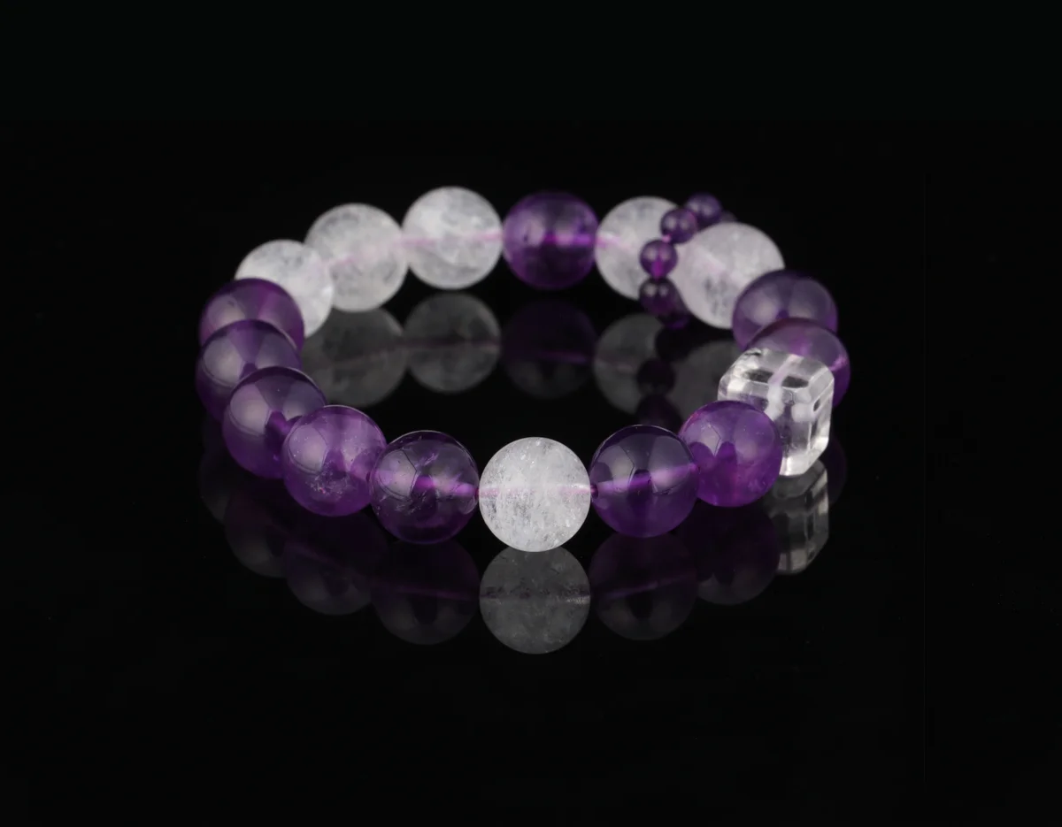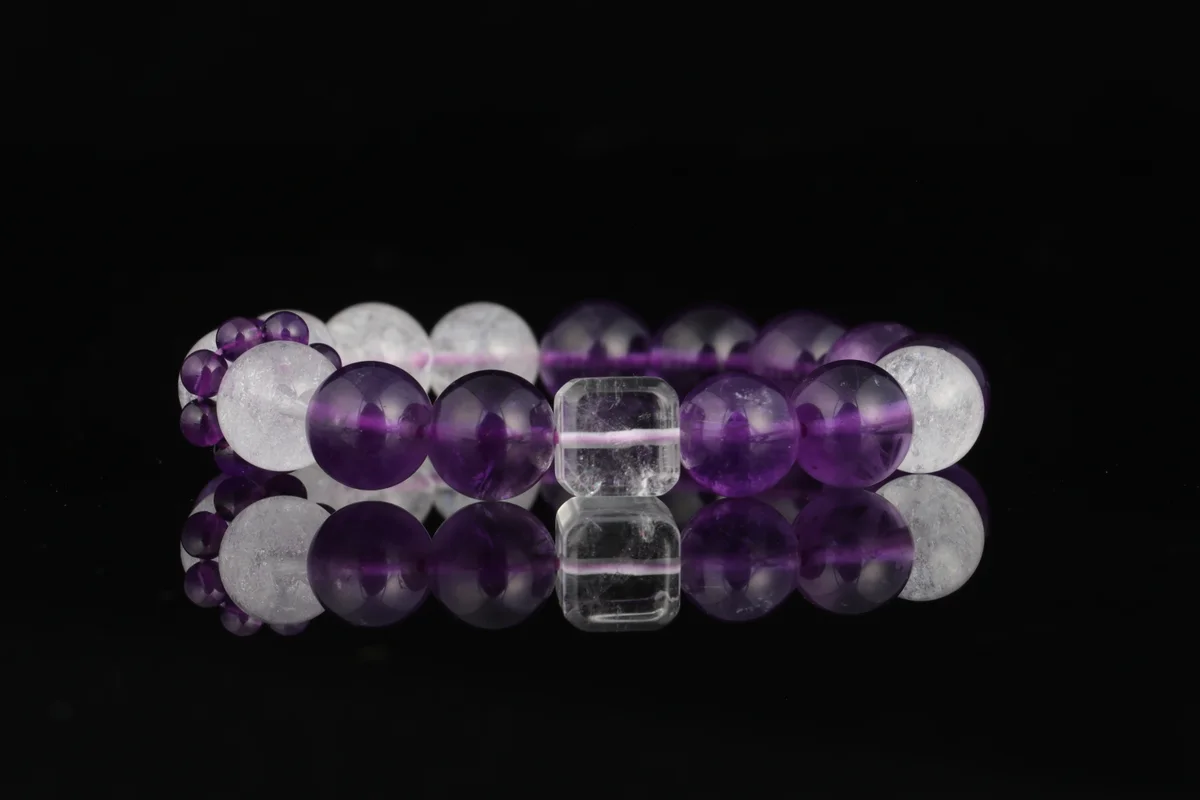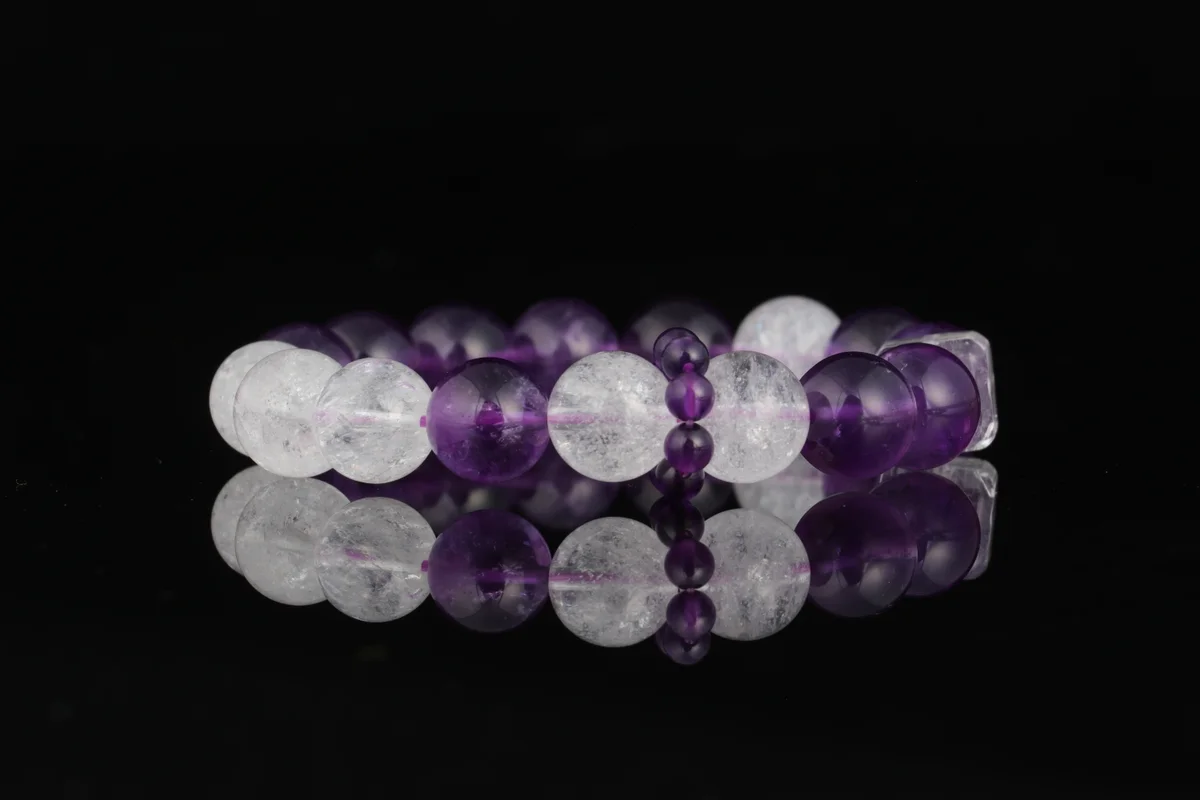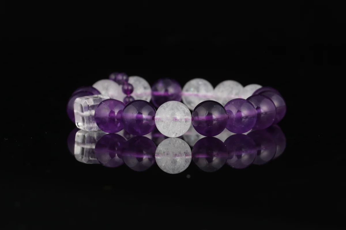 A.這款手鏈採用天然紫水晶材質,精選通透晶體,具有高品級白爆閃特性,在陽光下能折射出璀璨光芒。產品簡介強調其不僅是飾品,更是能量守護石,確保天然品質,對應頂輪以發揮舒緩壓力、改善睡眠等功效,適合作為健康水晶和事業水晶使用。
