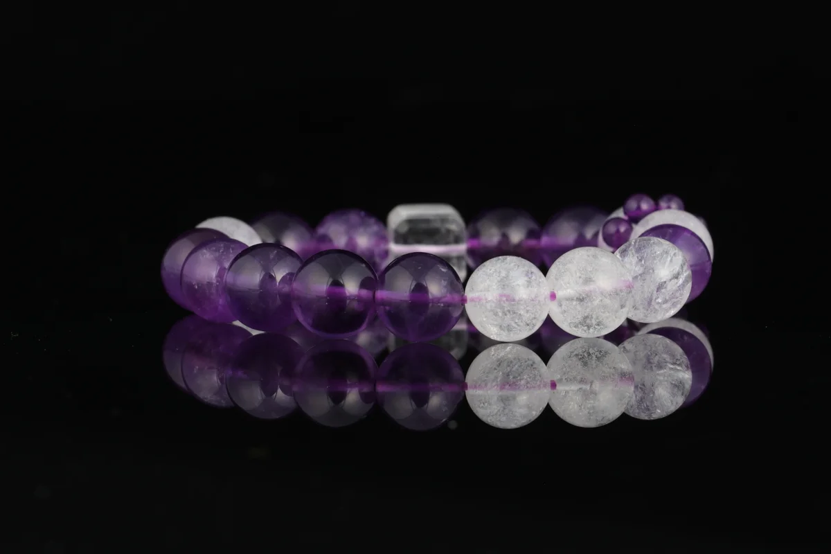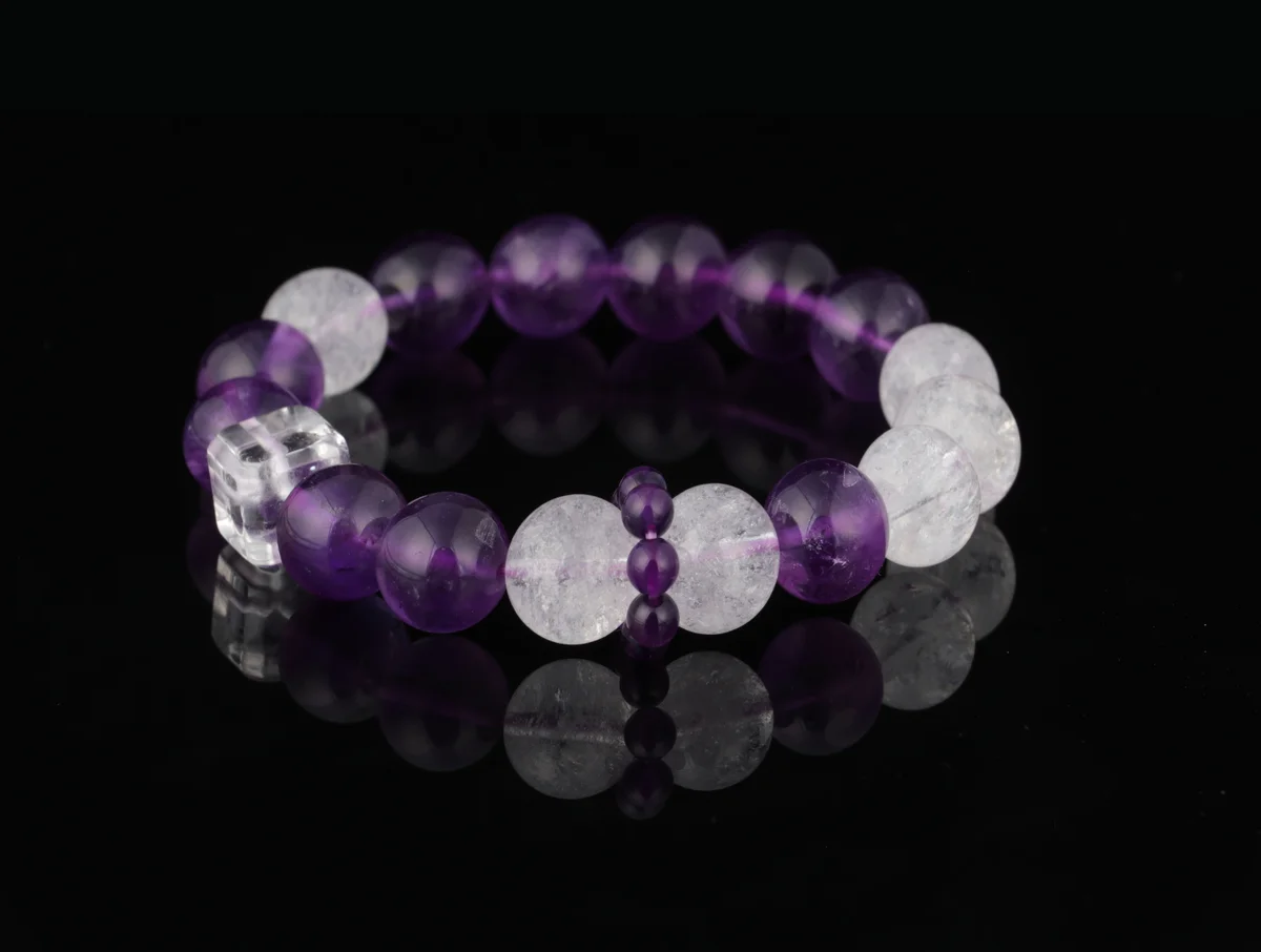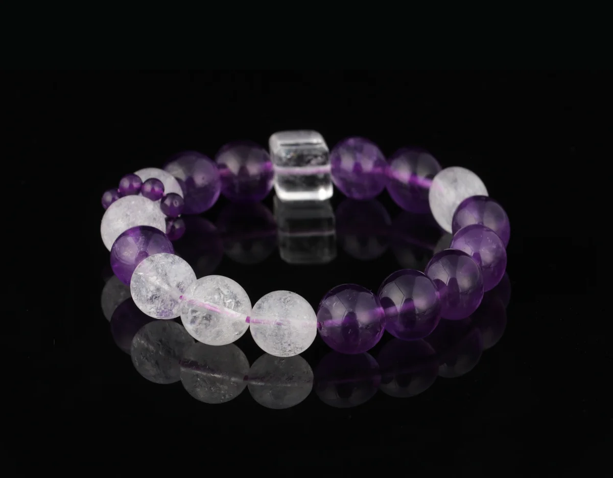 A.這款手鏈採用天然紫水晶材質,精選通透晶體,具有高品級白爆閃特性,在陽光下能折射出璀璨光芒。產品簡介強調其不僅是飾品,更是能量守護石,確保天然品質,對應頂輪以發揮舒緩壓力、改善睡眠等功效,適合作為健康水晶和事業水晶使用。